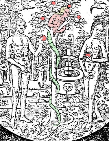 It shows Adam and Eve in the Garden of Eden.